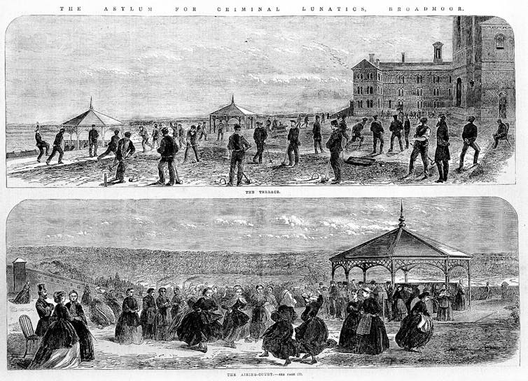 While some had high walls and locked doors to wards, many more were built with spatial therapy in mind: fresh air, cultivated lawns and leafy walkways around the perimeter were used to promote calmness and reflection. Patients might enjoy a cricket match with staff, or undertake occupational therapy in the purpose-built farmyard.