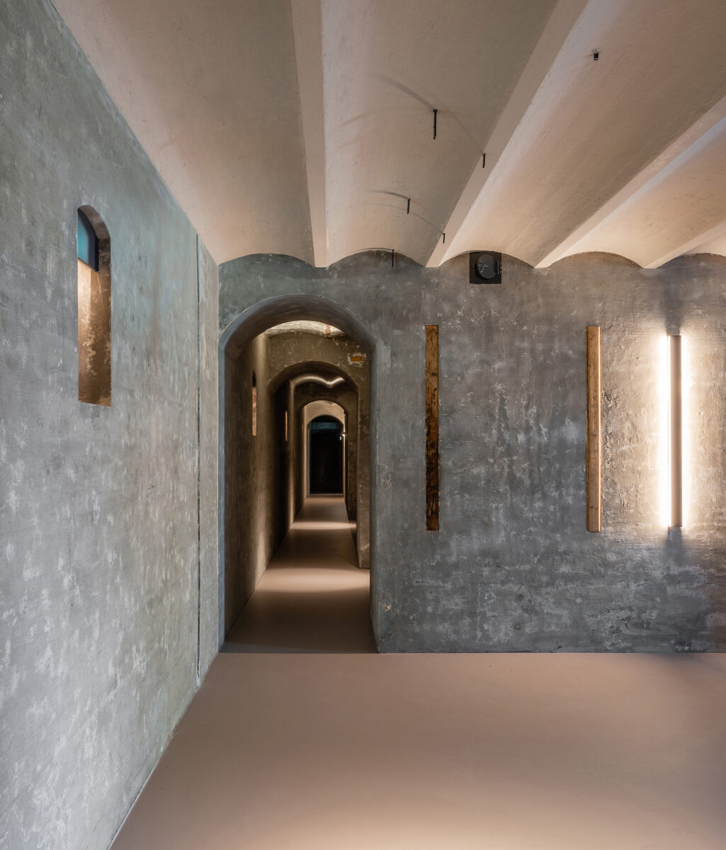 Embedded into the landscape and covered with a layer of earth, the fort consists of a labyrinth of spaces set across two floors. Its walls and vaults are made of thick unreinforced concrete. The fort complex includes two freestanding gun turret buildings topped by domes that are connected to the main building by underground corridors, which have now been restored to their original condition. Two new staircases have been added to improve access to the fort. Two vertical double-height spaces have also been created within, which draw light and air into the interior.