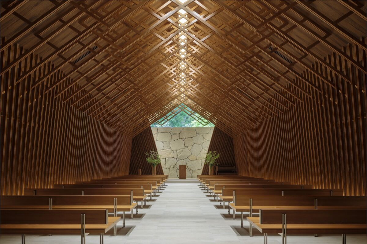 Light from the chapel’s roof apex weaves through the eye-catching lattice, evoking the effect of sunlight filtering through the branches of trees. The chapel’s connection to the adjacent woodland was also strengthened by redesigning the windows. Wooden louvers on the walls create a sense of depth and rhythm, and continue the aesthetic of the ceiling lattice to create an immersive interior.