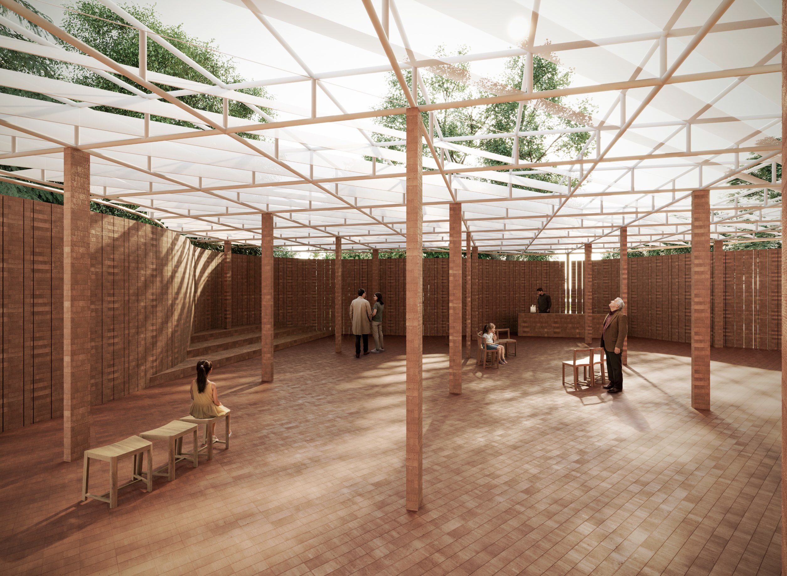 Set within Kensington Gardens, the pavilion is conceived in close dialogue with its landscape. One curving brick wall defines the primary spatial gesture, while a second wall responds to the existing tree canopy without disrupting it. Positioned on the northern side of the site, the structure is topped by a translucent roof that rests lightly on brick columns, evoking the feeling of moving through a grove of trees.