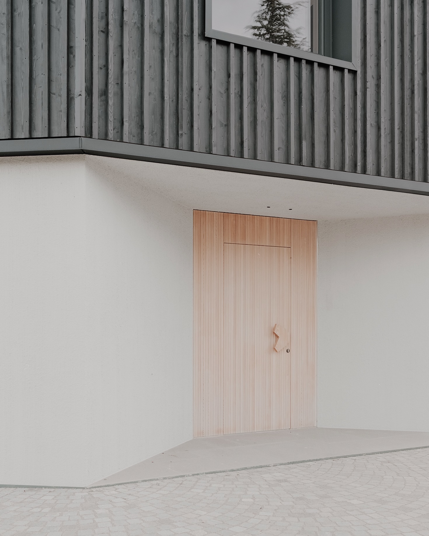 Thoughtfully executed on the site of the client’s parents’ former home, the exterior is defined by a bold black larch facade, treated with water to accentuate its grainy texture. Vertical panels and 4x4cm profiles break only for expansive windows and the building’s angular lines, while the local porphyry cobblestone driveway sets the tone long before one steps inside.
