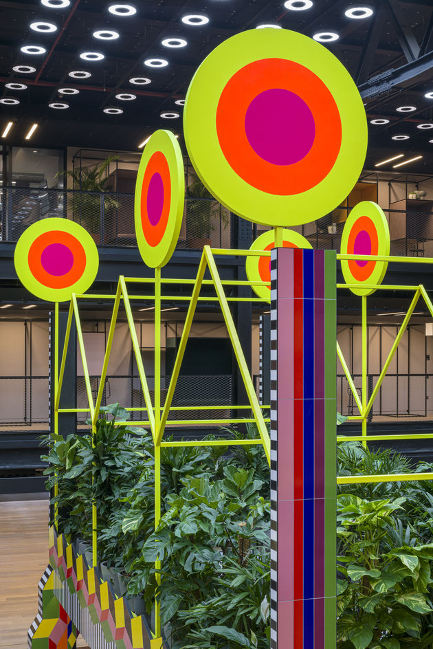 The pavilion, Myerscough’s first permanent internal installation, features her signature bold colours and energy and inspiration taken from London’s history. It also has a strong biophilic element, with the dense foliage at the top, designed to form an indoor park that references Victorian-era green spaces added to the built up city. Similarly, the mosaic tiling was inspired by Myerscough’s childhood home and the pavilion’s roof is inspired by the roofline of a typical London terrace. ‘The suns [on top of the pavilion] are also very important as they signify life, joy and energy,’ says Myerscough.