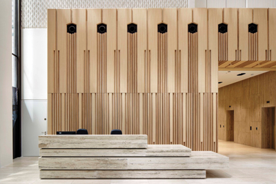 As for the visible interventions, the new entrance pavilion follows current trends in commercial property for enlarged and open reception halls. ‘We felt that the pavilion needed to have a rooted, classical feel, with a rudimentary and robust portico,’ says de Metz. A completely new addition to the building, accessed from ground level, its interior incorporates the concrete walls of the original, and also offers views up to the cantilevered ceremonial staircase through its perforated waffle ceiling. New finishes include plenty of travertine (also used for the sculptural reception desk) and the addition of timber structures, the motif of which – a row of clefts doubling up in density – is drawn from the panelling of Spence’s original Great Hall. This motif is used again in the external brise soleil, which de Metz describes as ‘being reminiscent of a portcullis, which lends a baronial feel to the new pavilion’, an intention entirely in keeping with the castle-like character of the original structure.