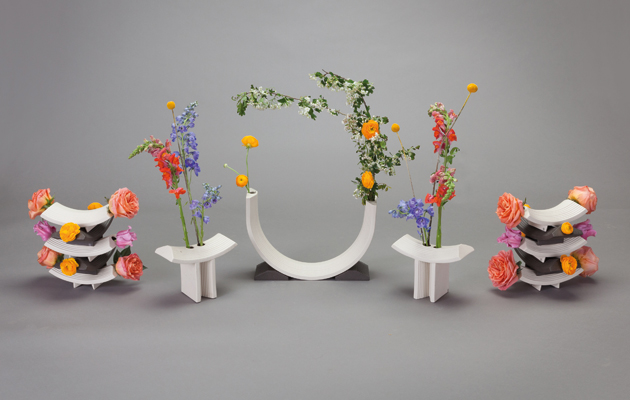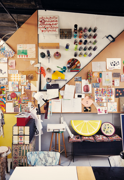 A wall of Wood’s studio covered in process work and references Noise is a word that pops up again and again in the young designer’s vocabulary. Many of her projects show an extraordinary effort to achieve the level of detail she requires, often employing established craft techniques to achieve new interpretations. For Hermès, it was hand painting, and later assembling, thousands of beads for a Christmas window concept here in the UK. For the Particle furniture series with regular collaborator Nilufar Gallery (2013), she used a type of modern marquetry to cover cabinets in pieced-together wood laminate of different finishes. A puzzle with thousands of individual pieces, the hand assembly gives the impression of army camouflage or the aggressive patching of oriented-strand board. Last year, for Kvadrat’s Divina exhibition in Milan, she made Guadalupe, a dazzling daybed, with embroiderer Laura Lees, using appliqué and different colourways to vivid effect. It’s easy to think that the pursuit of such complexity might consign Wood to the realms of bespoke design, but she’s also been working on her first production piece, Rainbow. Surprisingly not a reference to the colours, but rather the arced shape of rainbows, the ceramic vases and candleholders were shown at the Ace Hotel during London Design Festival last year. |