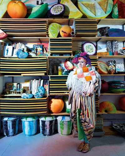 With her fantastical wardrobe and exuberant patterns, the east London designer was always going to get noticed. But behind the giant fruits and rainbow eyeliner is a thoughtful artist well able to control the noise There’s a down-the-rabbit-hole feeling as you draw back the heavy shutters to Bethan Laura Wood’s east London studio. In the young designer’s industrial base north of Hackney Marshes, certain things appear normal, while others seem to have grown fantastical in colour or proportion. There are books squeezed between giant hand-painted orange segments and blue patterned beans the size of handbags. There are plastic waste baskets sporting streaks of white and acid green that look like revered totems of influence rather than the everyday market tat they might ordinarily be taken for. And of course, there’s Wood herself. When she greets you, her unmistakable appearance – doll-like cheeks painted with pink circles, rainbow-coloured eyebrows, exotically drawn eyeliner and a mass of patterned layers that cover her from head to toe – marks her out as belonging to a peculiar tribe of one.