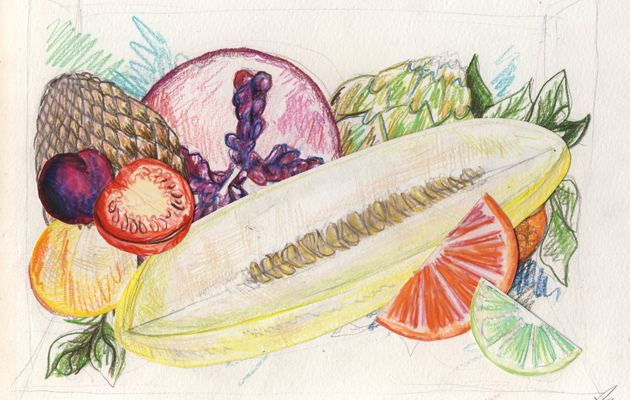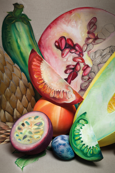 The larger-than-life beans and oranges, Wood tells me, are the leftovers of Fruits of Labour, a major window-design project for French luxury house Hermès. To showcase a collection that included printed silk scarves inspired by the post-impressionist Henri Rousseau, she created a display that merged a hand-painted flat backdrop with foreground props given a similar treatment, playing between two and three dimensions. “My generic thinking of tropical is parrots and bright colours, but Rousseau’s paintings are that hot dark [sense of] tropic. I wanted to get that feeling of depth that suits the brand but in a way that was a bit me, and a bit English. So I ended up making giant fruit and vegetables.” Drawings of fruit pieces and patterns made from their skin pocks and surface textures became a rich source for Wood’s window treatment. “The painted way of working gave me the detail and noise I like, but without fighting with the products on display.”