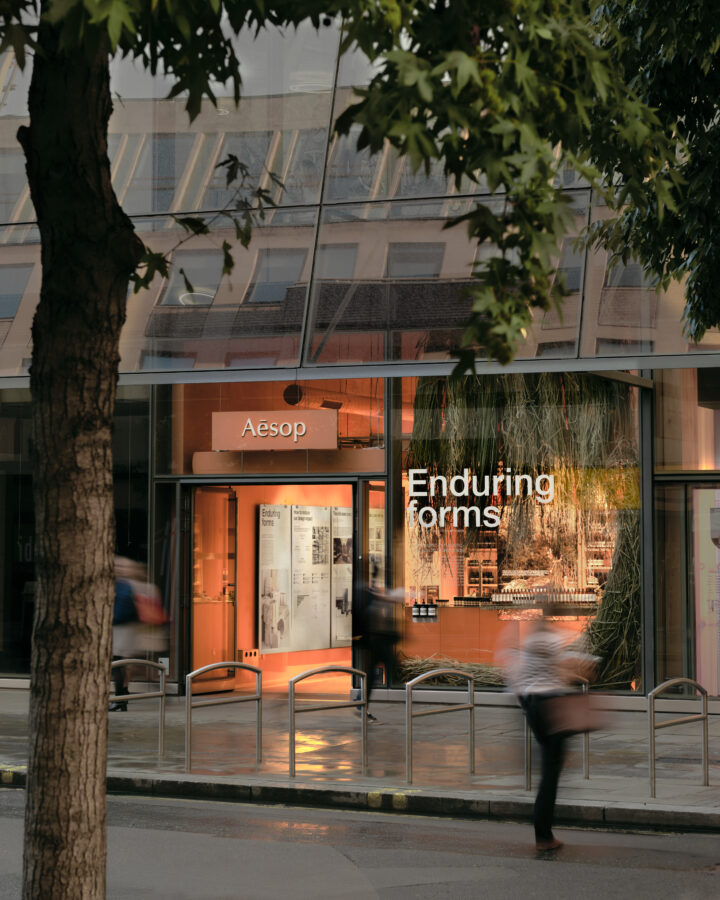 As part of London Design Festival, which begins today, a temporary exhibition is taking over Aesop One New Change, one of the brand’s most recent store openings which took place earlier this year. Titled ‘Enduring Forms’, the exhibition guides visitors through Aesop’s sustainable practices in store design while also being built entirely from repurposed materials. Within this immersive experience the intricate details of the brand’s creative approach will be outlined through past examples of some of their global stores and how they embed themselves within the neighbourhoods and streetscapes they inhabit. ‘It’s a pragmatic approach deciding on how the store will speak to its local community,’ explains Marianne Lardilleux, the brand’s Global Retail Design Director. ‘Each store is inspired by its environment and is respectful to its surroundings and of the local culture.’