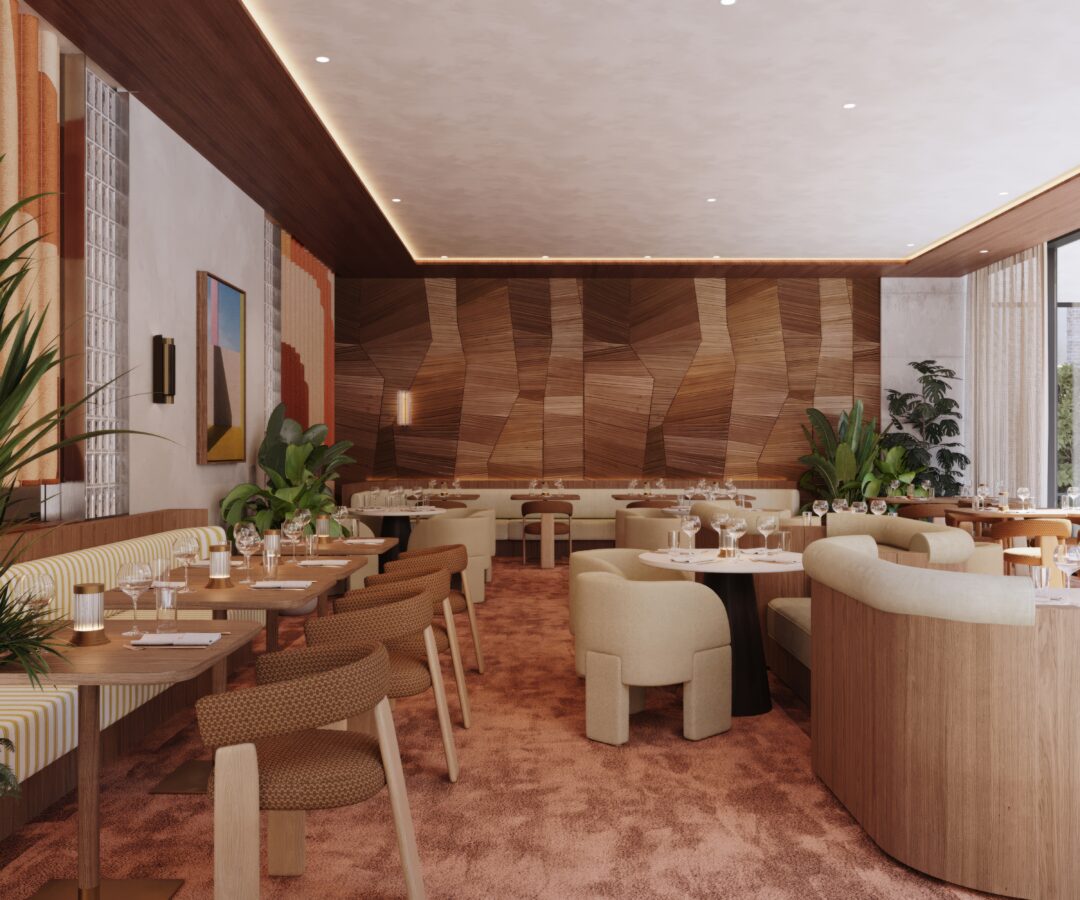 Photography courtesy of Astet, Astet have overseen the interior design of each space including the restaurant which includes natural textures and warm tones inspired by the heritage and urban landscape of Shoreditch
