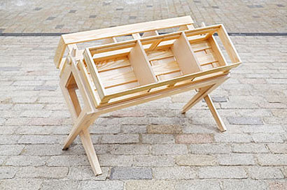 Fotis Evans London Metropolitan University, BA Furniture & Product Design Somerset House bookstall System Fotis Evans won a competition to design a flexible bookstall for Somerset House last year, but when Somerset House didn’t invest in making the prototype a full-scale model, he decided to go it alone. It’s a flexible system inspired by bookstalls and flea markets and, we think, the Isokon Penguin Donkey. The construction is simple: a collapsible table that can be folded flat and two bookcases that can either rest on the table in two different positions or stand alone as small bookcases.