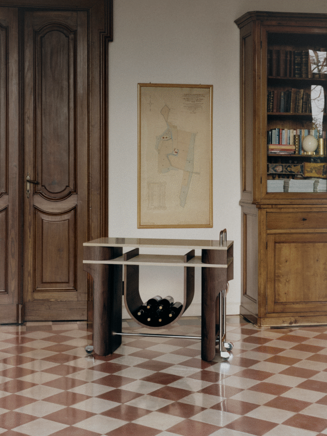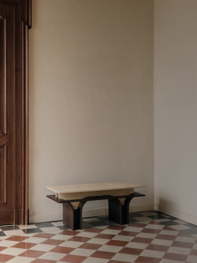 For this specific collection, forms borrowed from stripped architectural facades allude to Art Deco influences but with a modern, almost futuristic, twist. ‘I hope the pieces convey a sense of quiet presence, architecturally familiar, sculptural yet usable,’ he says. ‘They are designed to feel stable, considered, and most importantly, intentional.’ Consisting of a daybed, bar cart and bench, the collection pairs wood with stone, materials that can be considered modest but, in this instance, feel elevated through artisanal construction and sophisticated detailing. ‘Rather than immediate impact, the work is meant to reveal itself over time,’ von Werp continues. ‘Subtle details, material transitions, and the way light interacts with form become more apparent through use. Ideally, the object becomes part of its environment and daily rhythm, developing a relationship with the user rather than demanding attention.’