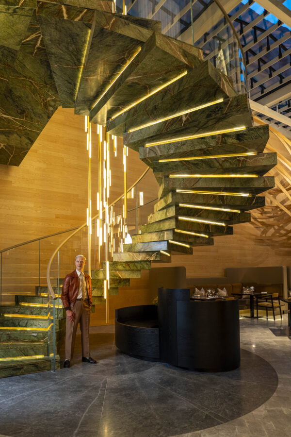 In connecting the lobby and the restaurant together, the chandelier also emphasises how lighting can elevate a space entirely, especially within hospitality environments. ‘Light shapes emotion and it sets the tone immediately,’ says Broom. ‘Anyone who stays in a hotel wants to experience a number of different things, including a sense of escapism and something more elevated than their everyday life at home. With that in mind, light becomes the perfect vehicle to orchestrate drama and wonder. People are instinctively drawn to light, and when it is combined with sculpture, it creates an irresistible fusion, one that transforms a space into an experience.’