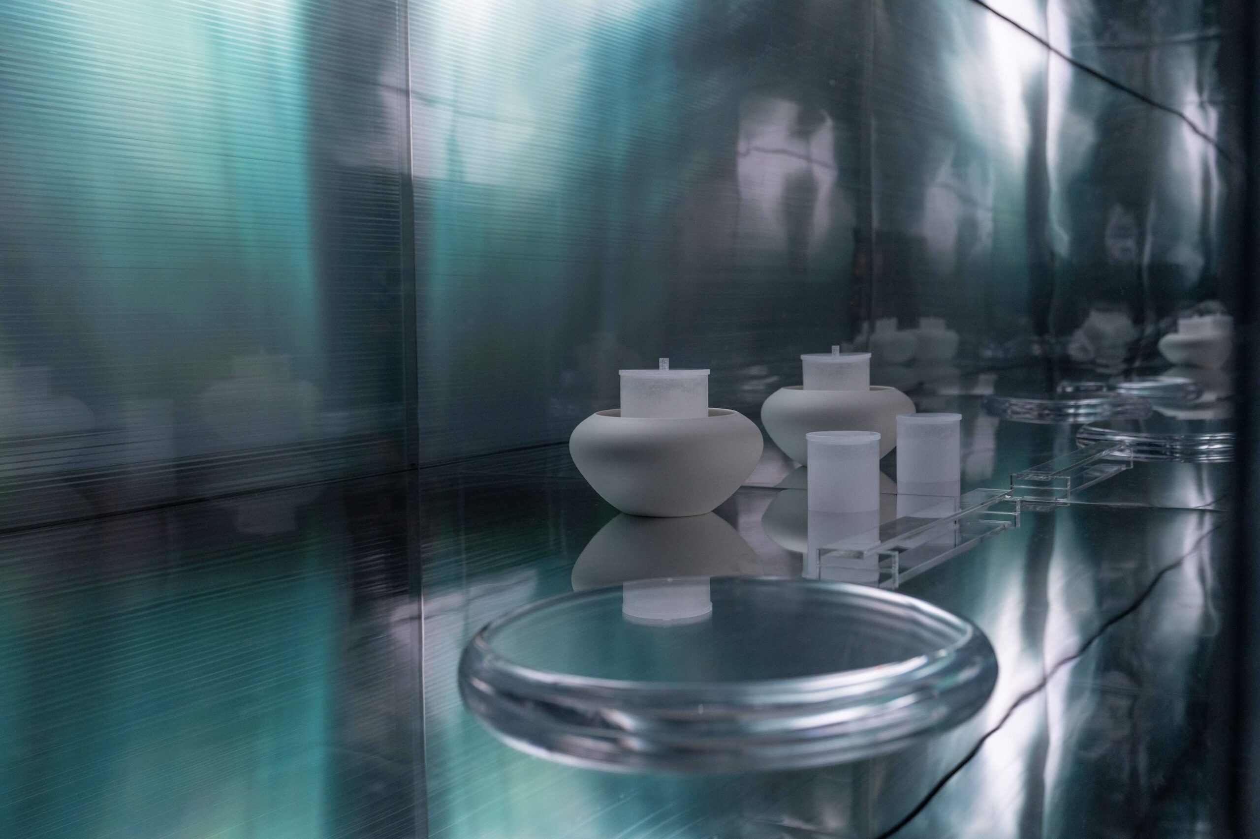 All imagery for the installation is drawn from photographs and footage captured during their travels across America, Europe and beyond. Hayashi and Kurotani revisited this archive, selecting material marked by specific qualities of light to set the emotional tone of the space. These visual references are carried into the installation, including vessels inspired by those used in traditional tea ceremonies, where water is boiled and poured as part of the ritual.