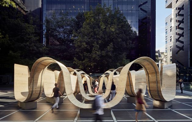 Designer Paul Cocksedge has created a multipurpose installation for British Land, creating a sculptural design that serves as seating, shade and public art. The large-scale, circular design is made of recycled scaffolding planks, shaped to curve up and down, allowing people to walk under and through the installation, as well as taking a seat in the dip of each parabola.