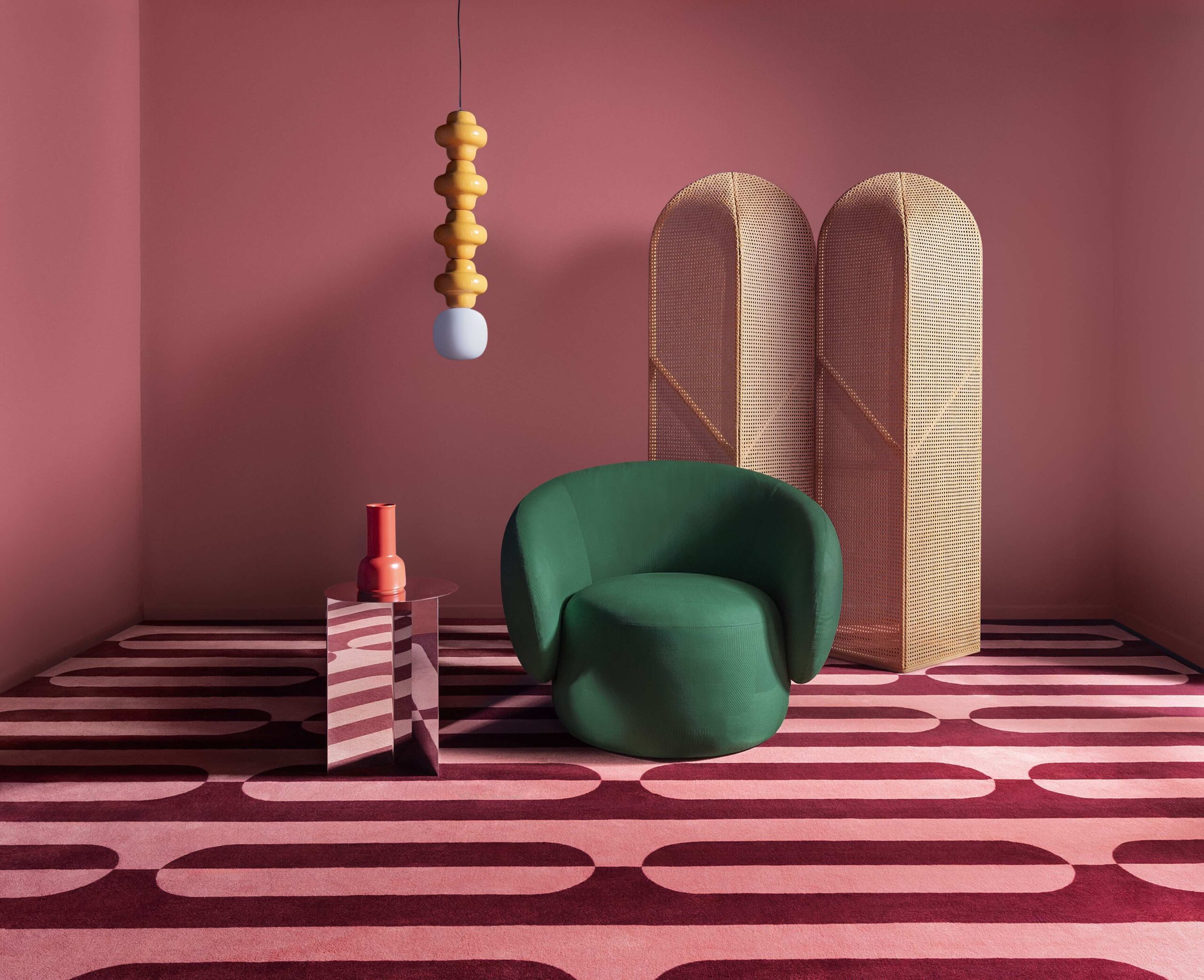Beyond aesthetics, Newstalgia also prioritises sustainability. Using Radici’s Bloom Black textile flooring, crafted from fully recyclable Econyl yarn, the designs merge with Severin’s mission to create pieces that are as forward-thinking in production as they are visually striking. ‘Colour is never absolute,’ Severin says. ‘It’s always relative – it’s what you put next to it that defines it.’